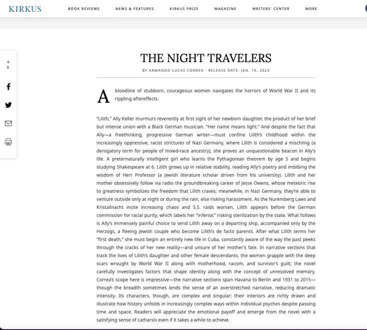 Correa (The Daughter’s Tale) unfurls a stunning multigenerational story involving WWII Germany and the Cuban Revolution. In 1931 Berlin, poet Ally Keller gives birth to Lilith, her daughter with jazz musician Marcus, a Black German man. After Marcus goes missing, and as Germany marches toward war, Ally fears Lilith may be targeted by the Nazis because of her skin color, so she begs her Jewish neighbors, Beatrice and Albert Herzog, to take seven-year-old Lilith with them to Cuba. As Lilith adapts to life in Cuba with the Herzogs, she befriends Martín Bernal, and they eventually marry. But Martín’s alliance with Batista’s government puts him in danger when Fidel Castro comes to power, forcing him to leave Lilith and their daughter Nadine alone after he is captured, and Lilith arranges for Nadine to leave Cuba for the U.S., where she’s adopted by an American couple. Years later, Nadine attends college in Germany, and while working as a scientist at a research center in Berlin, her interest in her heritage leads her to information about her birth mother’s early years. Correa makes palpable the sacrifices made by Ally and Lilith for their children’s survival, and the taut pacing keeps the pages flying. Readers will be deeply moved. Agent: Johanna Castillo, Writers House.(Jan.)